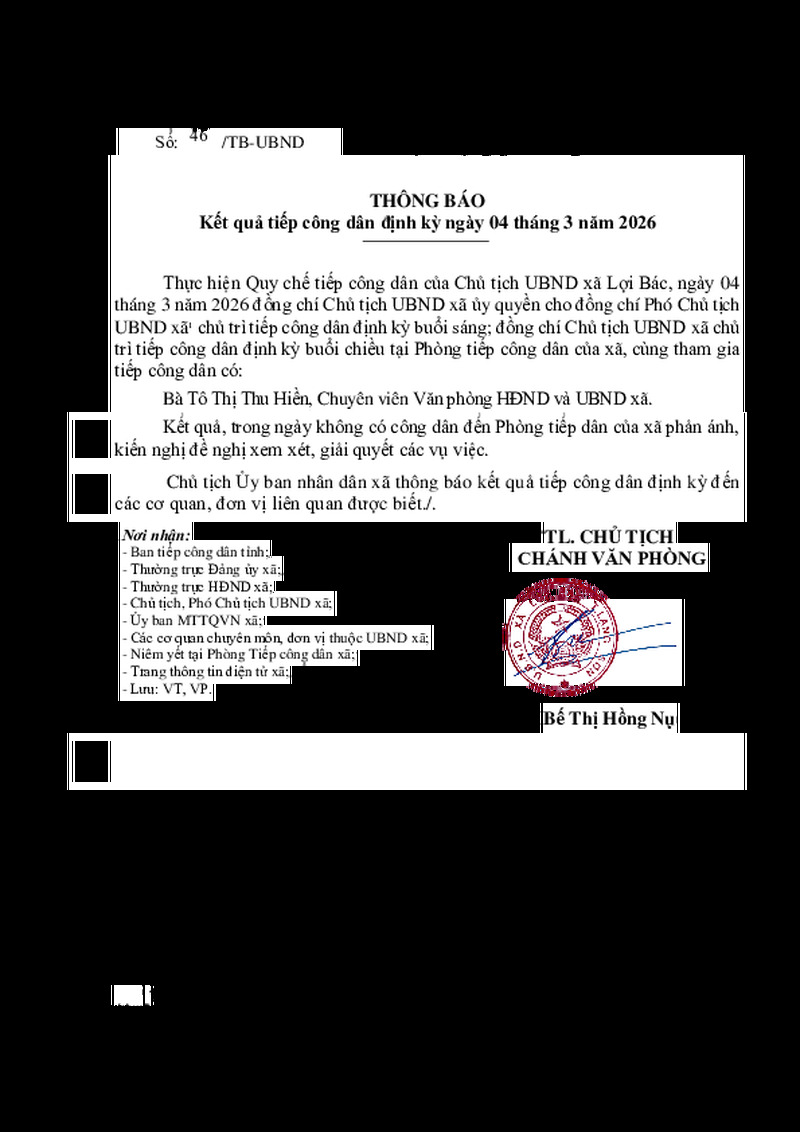 | Tiêu đề văn bản | THÔNG BÁO Kết quả tiếp công dân định kỳ ngày 04 tháng 3 năm 2026 | ||