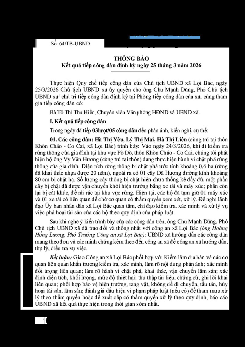 | Tiêu đề văn bản | THÔNG BÁO Kết quả tiếp công dân định kỳ ngày 25 tháng 3 năm 2026 | ||
