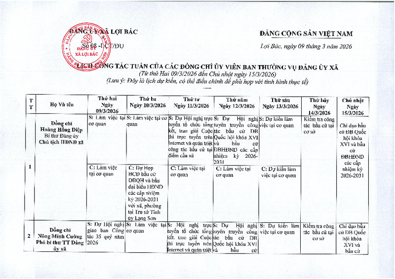 | Tiêu đề văn bản | LỊCH CÔNG TÁC TUẦN CỦA CÁC ĐỒNG CHÍ ỦY VIÊN BAN THƯỜNG VỤ ĐẢNG ỦY XÃ (Từ thứ Hai 09/3/2026 đến Chủ nhật ngày 15/3/2026) (Lưu ý: Đây là lịch dự kiến, có thể điều chinh để phù hợp với tình hình thực tế) | ||