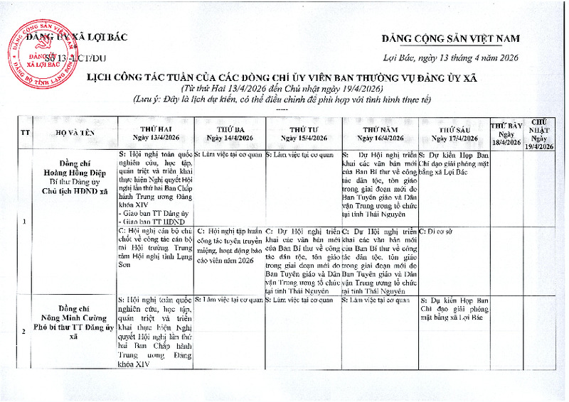 | Tiêu đề văn bản | LỊCH CÔNG TÁC TUẦN CỦA CÁC ĐỒNG CHÍ ỦY VIÊN BAN THƯỜNG VỤ ĐẢNG ỦY XÃ (Từ thứ Hai 13/4/2026 đến Chủ nhật ngày 19/4/2026) | ||