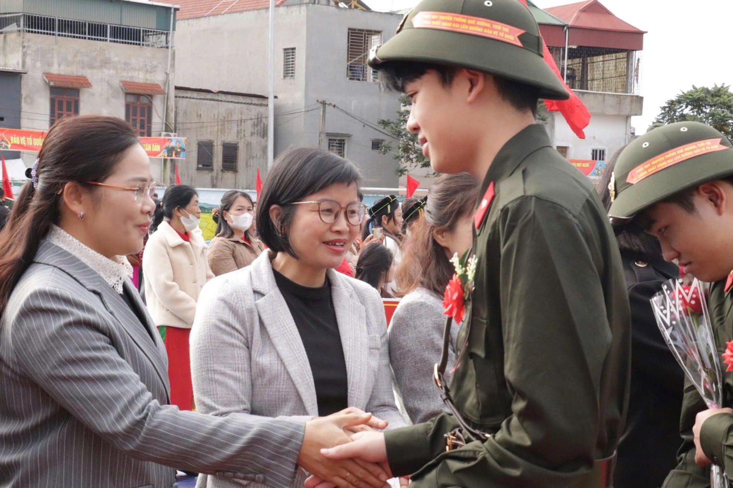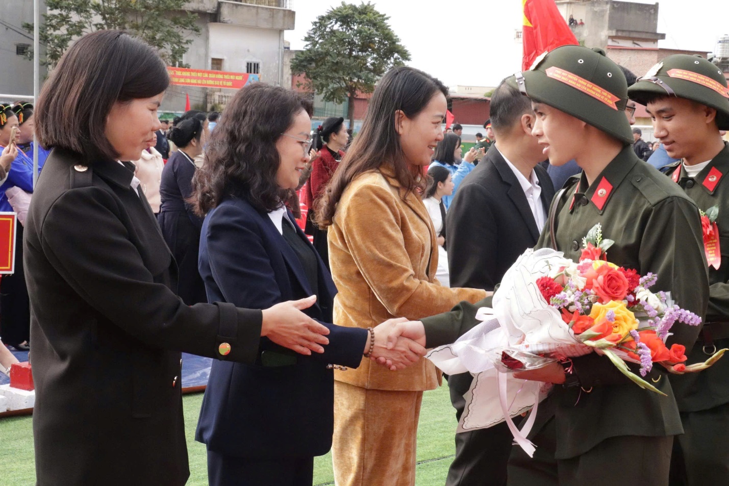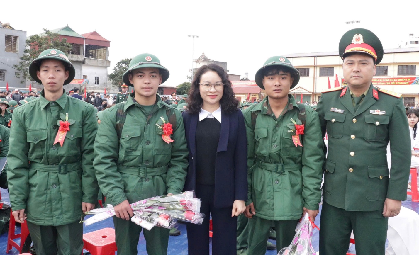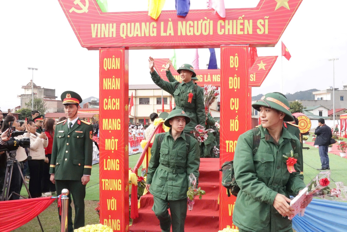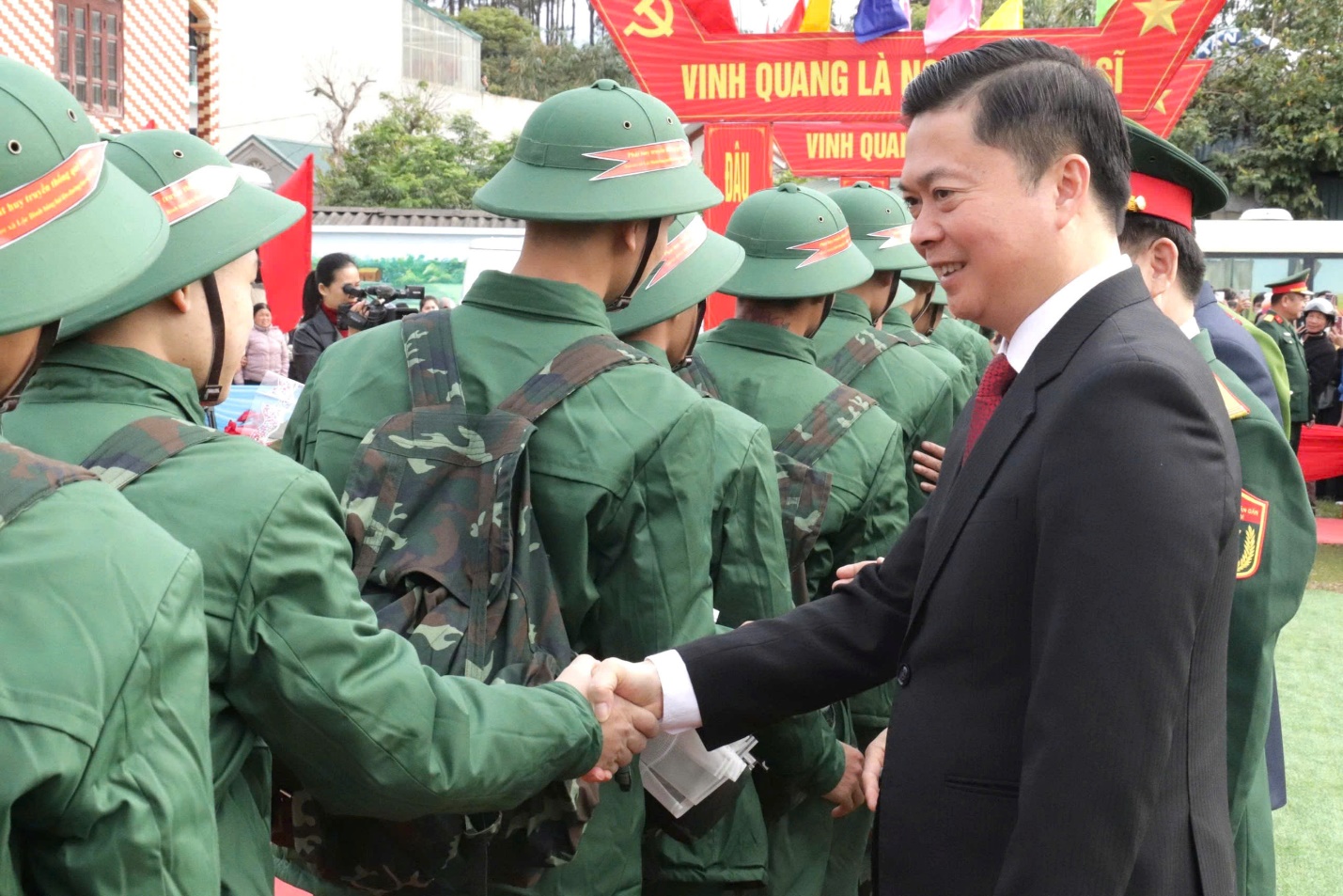Tại đây, đồng chí Phó Chủ tịch Thường trực UBND tỉnh, cùng các đại biểu tham dự đã tặng hoa và chúc mừng, động viên tân binh lên đường nhập ngũ; chúc các đồng chí nỗ lực học tập, rèn luyện, hoàn thành tốt các nhiệm vụ được giao, góp sức vào công cuộc xây dựng và bảo vệ Tổ quốc.