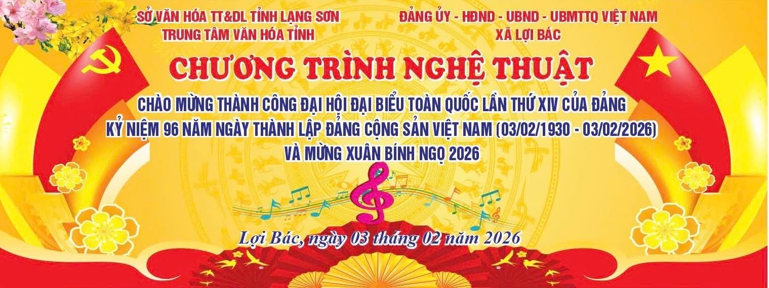 Tối ngày 03/02/2026 (thứ Ba), vào lúc 19h30' tại trụ sở xã Lợi Bác, địa chỉ thôn Nà U, xã Lợi Bác, tỉnh Lạng Sơn sẽ diễn ra Chương trình nghệ thuật Chào mừng thành công Đại hội Đảng toàn quốc lần thứ XIV, kỷ niệm 96 năm ngày thành lập Đảng Cộng sản Việt Nam và chào đón xuân Bính Ngọ 2026 do Đảng ủy - HĐND - UBND - Uỷ ban MTTQ Việt Nam xã Lợi Bác tổ chức.