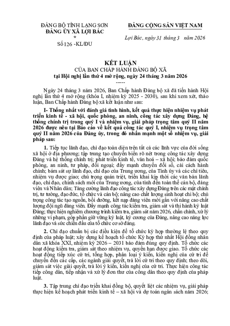| Tiêu đề văn bản | KẾT LUẬN CỦA BAN CHẤP HÀNH ĐẢNG BỘ XÃ tại Hội nghị lần thứ 4 mở rộng, ngày 24 tháng 3 năm 2026 | ||