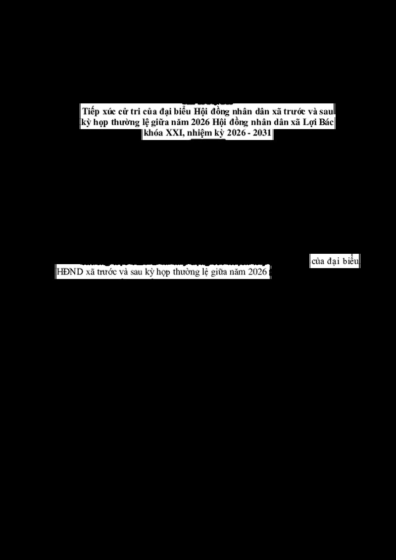 | Tiêu đề văn bản | KẾ HOẠCH Tiếp xúc cử tri của đại biểu Hội đồng nhân dân xã trước và sau kỳ họp thường lệ giữa năm 2026 Hội đồng nhân dân xã Lợi Bác khóa XXI, nhiệm kỳ 2026 - 2031 | ||