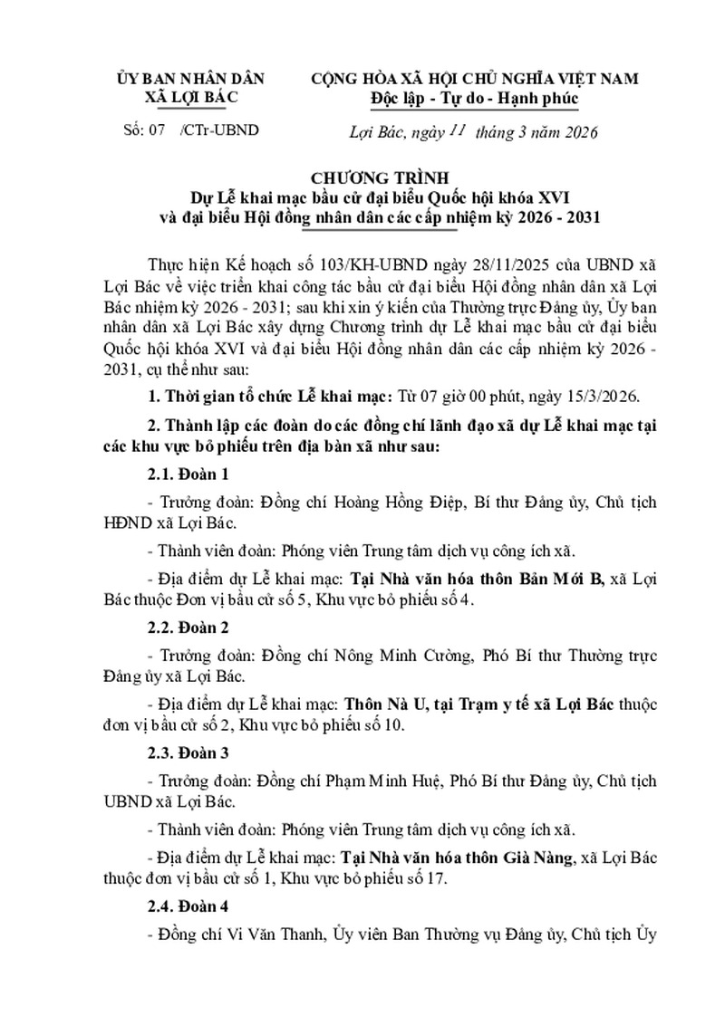 | Tiêu đề văn bản | CHƯƠNG TRÌNH Dự Lễ khai mạc bầu cử đại biểu Quốc hội khóa XVI và đại biểu Hội đồng nhân dân các cấp nhiệm kỳ 2026 - 2031 | ||