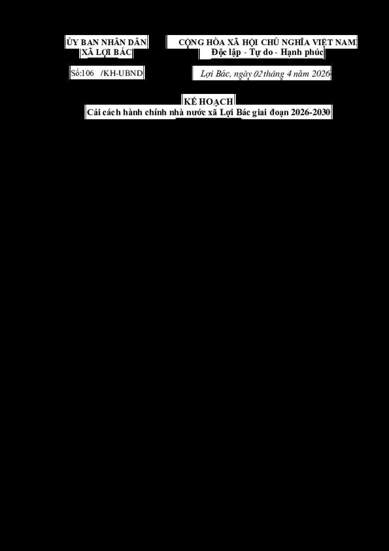 | Tiêu đề văn bản | KẾ HOẠCH Cải cách hành chính nhà nước xã Lợi Bác giai đoạn 2026-2030 | ||