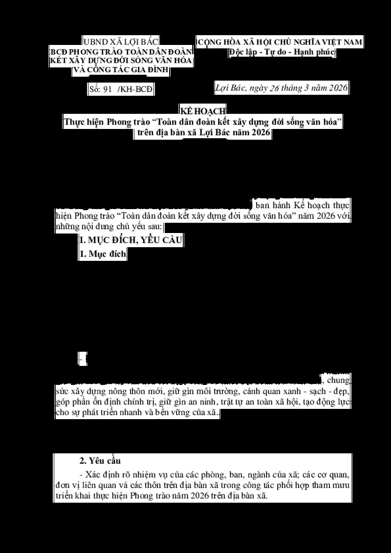 | Tiêu đề văn bản | KẾ HOẠCH Thực hiện Phong trào “Toàn dân đoàn kết xây dựng đời sống văn hóa” trên địa bàn xã Lợi Bác năm 2026 | ||