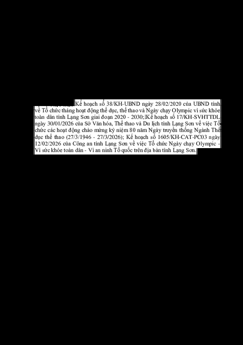 | Tiêu đề văn bản | KẾ HOẠCH Tổ chức Lễ phát động Cuộc vận động “Toàn dân rèn luyện thân thể theo gương Bác Hồ vĩ đại” và Ngày chạy Olympic vì sức khỏe toàn dân – Vì an ninh Tổ quốc năm 2026 | ||