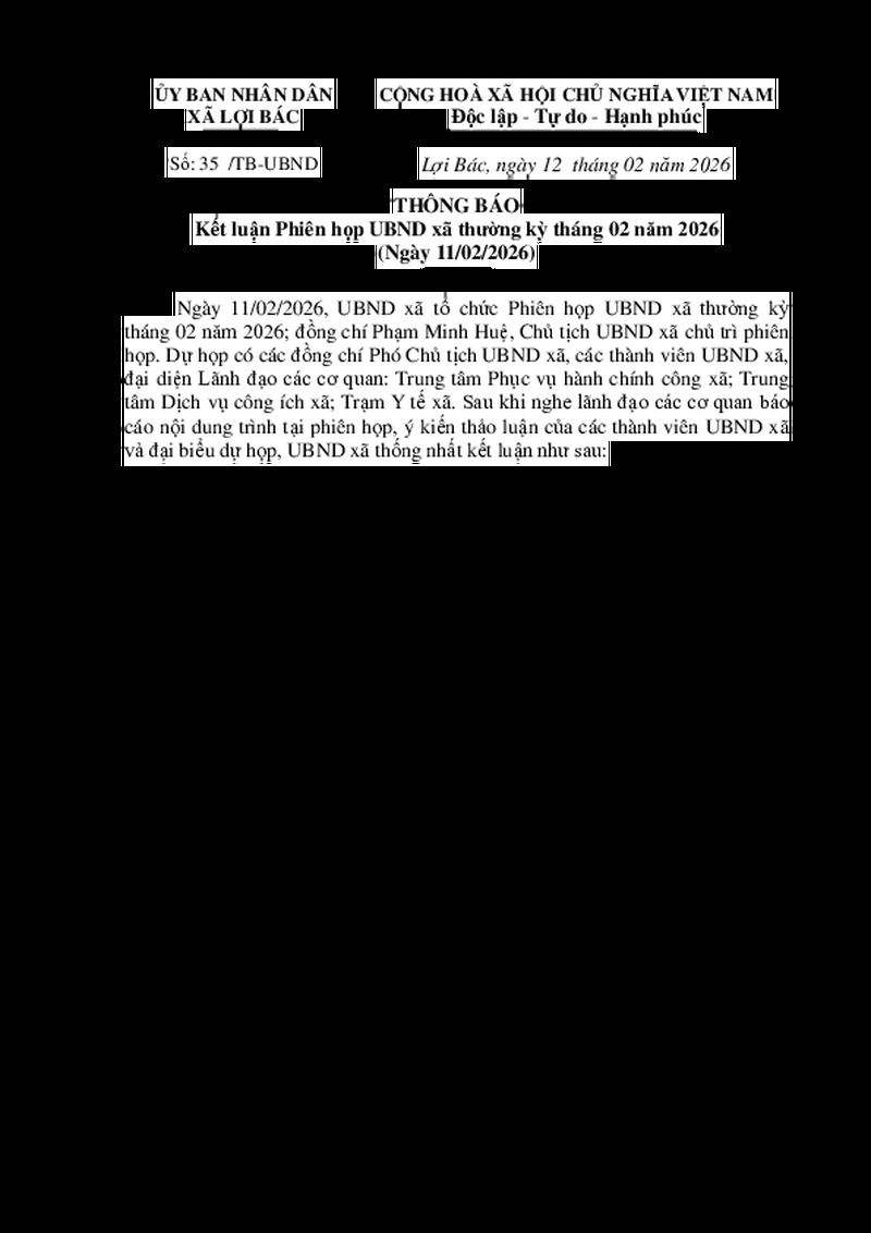 | Tiêu đề văn bản | THÔNG BÁO Kết luận Phiên họp UBND xã thường kỳ tháng 02 năm 2026 (Ngày 11/02/2026) | ||