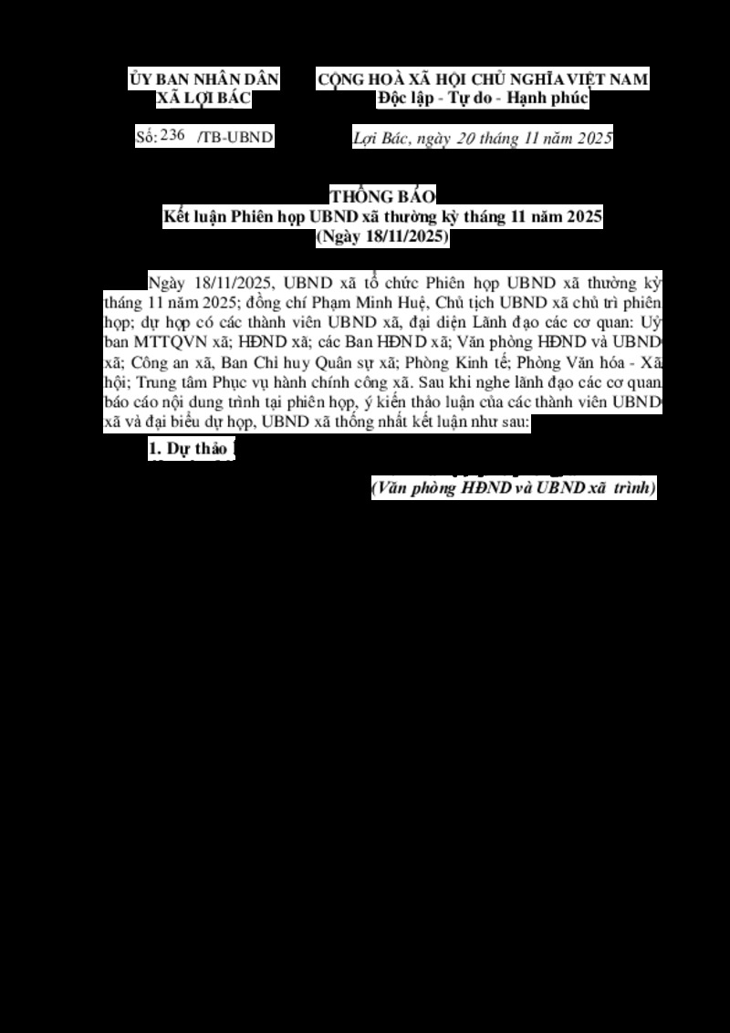 | Tiêu đề văn bản | THÔNG BÁO Kết luận Phiên họp UBND xã thường kỳ tháng 11 năm 2025 (Ngày 18/11/2025) | ||