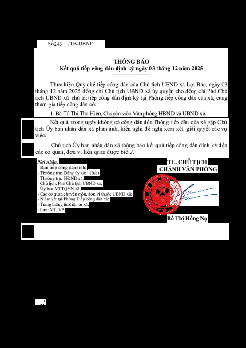 | Tiêu đề văn bản | THÔNG BÁO Kết quả tiếp công dân định kỳ ngày 03 tháng 12 năm 2025 | ||