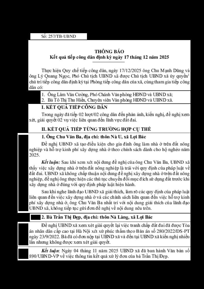 | Tiêu đề văn bản | THÔNG BÁO Kết quả tiếp công dân định kỳ ngày 17 tháng 12 năm 2025 | ||