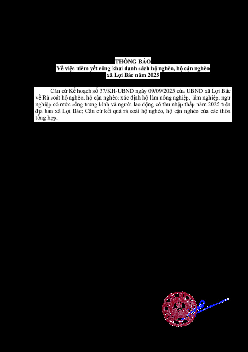 THÔNG BÁO Về việc niêm yết công khai danh sách hộ nghèo, hộ cận nghèo xã Lợi Bác năm 2025