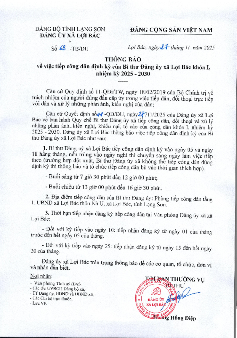 | Tiêu đề văn bản | THÔNG BÁO về việc tiếp công dân định kỳ của Bí thư Đảng ủy xã Lợi Bác khóa I, nhiệm kỳ 2025 - 2030 | ||