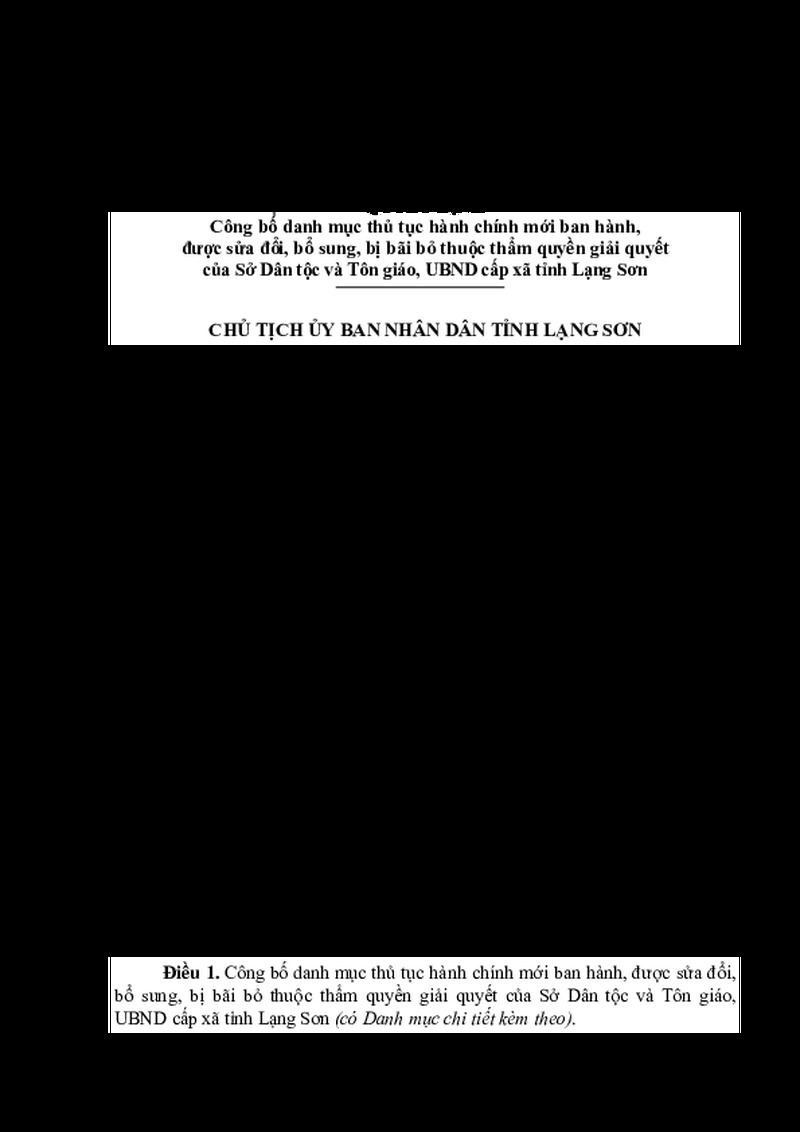 | Tiêu đề văn bản | QUYẾT ĐỊNH Công bố danh mục thủ tục hành chính mới ban hành, được sửa đổi, bổ sung, bị bãi bỏ thuộc thẩm quyền giải quyết của Sở Dân tộc và Tôn giáo, UBND cấp xã tỉnh Lạng Sơn | ||
