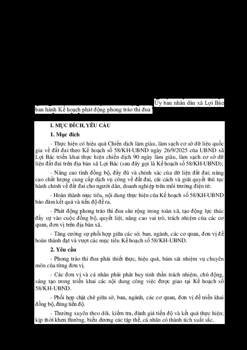| Tiêu đề văn bản | KẾ HOẠCH Phát động phong trào thi đua “Làm giàu, làm sạch cơ sở dữ liệu quốc gia về đất đai” trên địa bàn xã Lợi Bác | ||