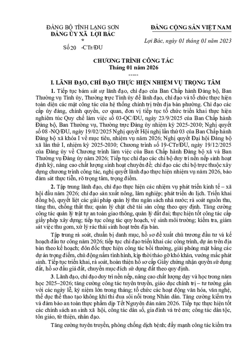 | Tiêu đề văn bản | CHƯƠNG TRÌNH CÔNG TÁC Tháng 01 năm 2026 | ||