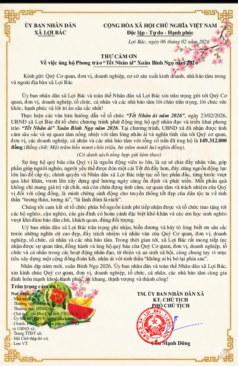 THƯ CẢM ƠN Về việc ủng hộ Phong trào “Tết Nhân ái” Xuân Bính Ngọ năm 2026