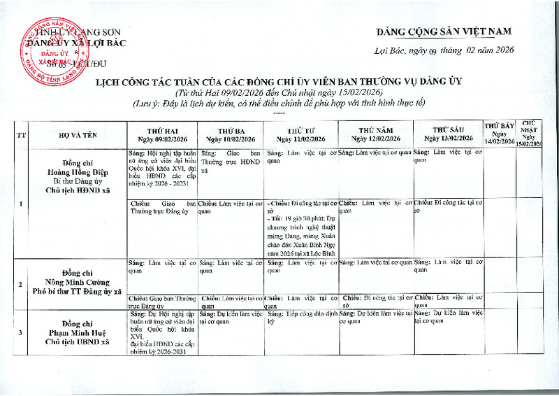 | Tiêu đề văn bản | LỊCH CÔNG TÁC TUẦN CỦA CÁC ĐỒNG CHÍ ỦY VIỄN BAN THƯỜNG VỤ ĐẢNG ỦY (Từ thứ Hai 09/02/2026 đến Chủ nhật ngày 15/02/2026) (Lưu ý: Đây là lịch dự kiến, có thể điều chinh để phù hợp với tình hình thực tế) | ||