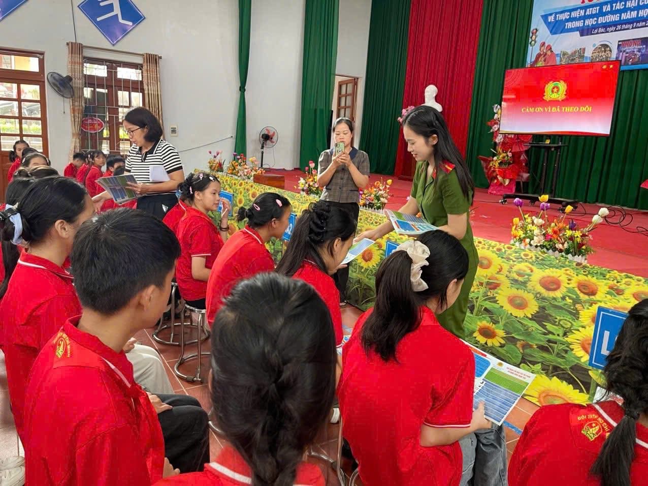 Hình ảnh Công an xã Lợi Bác phát tờ rơi cho các em học sinh tại buổi tuyên truyền
