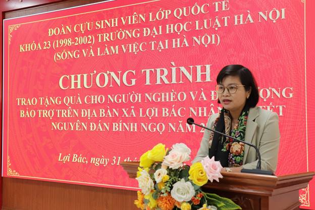 Trong chương trình, đại diện Đoàn cựu sinh viên lớp Quốc tế khóa 23 (1998 - 2002) trường Đại học Luật Hà Nội gửi lời chúc mừng năm mới, an khang thịnh vượng tới bà con xã Lợi Bác và chia sẻ: Chương trình tặng quà là tình cảm, sự sẻ chia của Đoàn đối với các hộ nghèo, hộ cận nghèo, gia đình chính sách và người có hoàn cảnh đặc biệt khó khăn trong xã, mong muốn góp phần giúp các gia đình đón Tết cổ truyền dân tộc ấm áp, đủ đầy hơn.