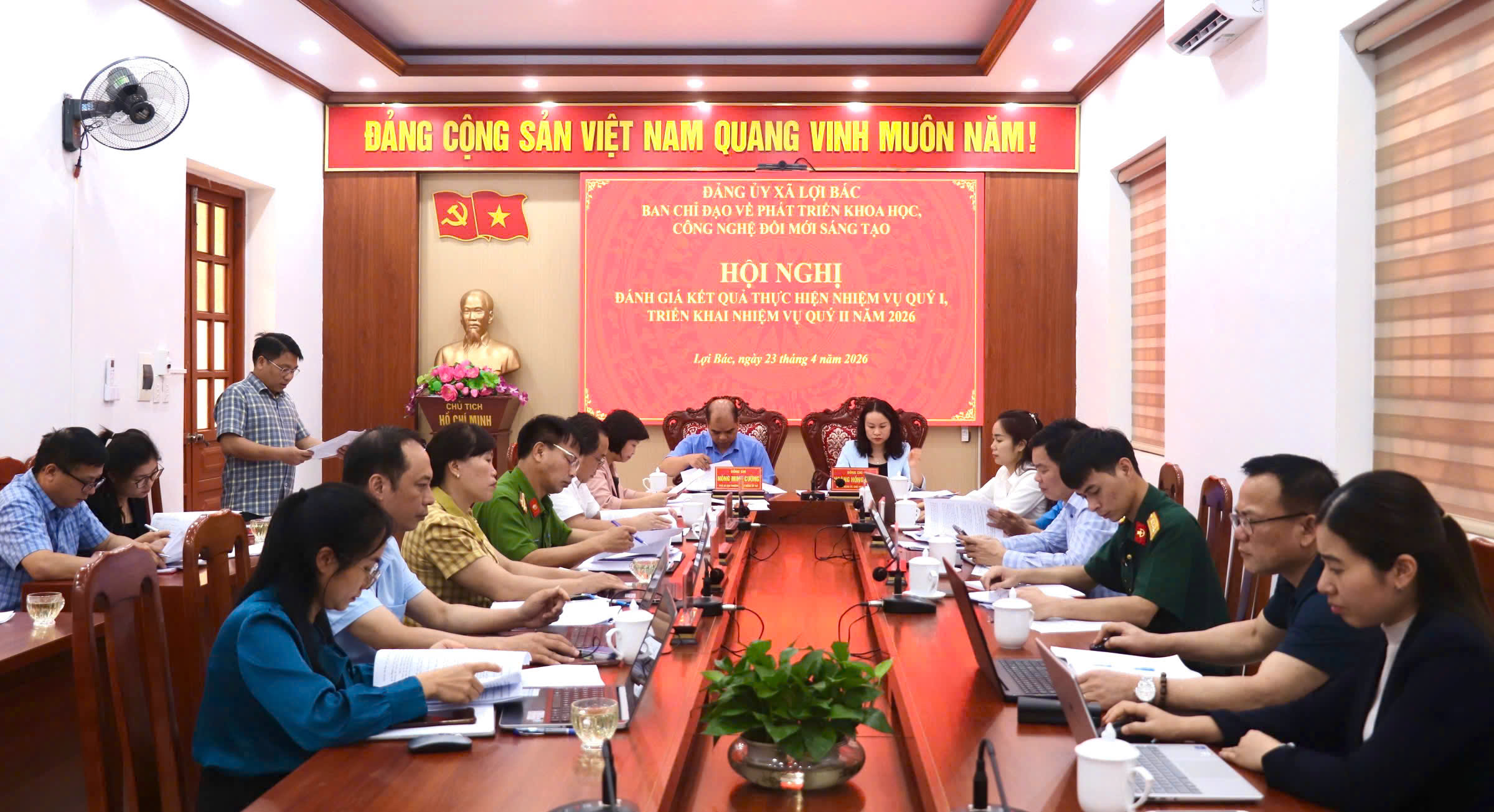 Sáng 23/4/2026, Ban Chỉ đạo về phát triển khoa học, công nghệ, đổi mới sáng tạo và chuyển đổi số xã Lợi Bác (Ban Chỉ đạo) đánh giá kết quả thực hiện nhiệm vụ Quý I, triển khai nhiệm vụ Quý II năm 2026. Đồng chí Hoàng Hồng Điệp, Bí thư Đảng ủy, Chủ tịch HĐND xã, Trưởng Ban Chỉ đạo chủ trì cuộc họp.