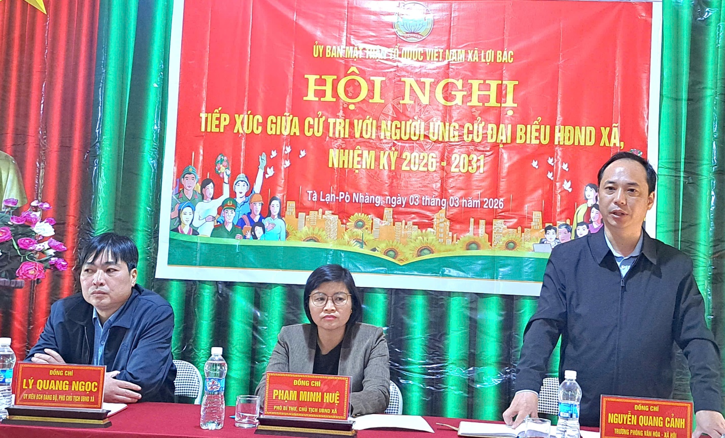 Ngày 03/03/2026, Ban Thường trực Ủy ban MTTQ Việt Nam xã Lợi Bác tổ chức Hội nghị tiếp xúc cử tri giữa những người ứng cử đại biểu HĐND xã Lợi Bác, khóa XXI, nhiệm kỳ 2026 – 2031 (thuộc đơn vị bầu cử số 03) tại các thôn Tà Lạn - Pò Nhàng, Nà Làng, xã Lợi Bác.