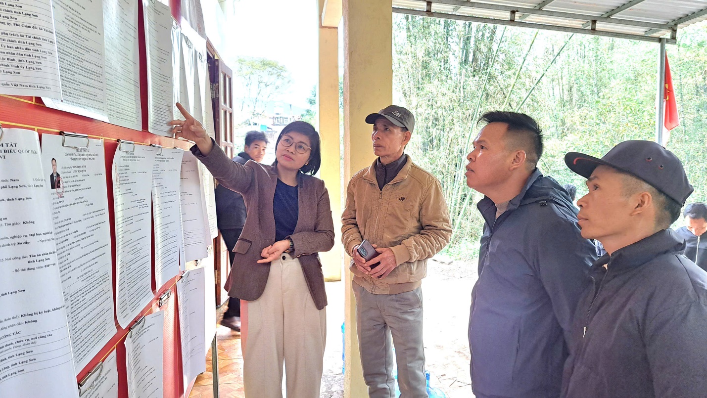 Bà Phạm Minh Huệ, Phó Bí thư Đảng ủy, Chủ tịch UBND xã Lợi Bác, hướng dẫn các cử tri xem danh sách các ứng cử viên đại biểu HĐND các cấp