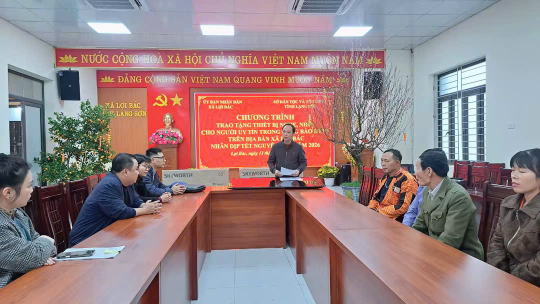 Chiều ngày 13/2/2026, Sở Dân tộc và Tôn giáo phối hợp với UBND xã Lợi Bác tổ chức chương trình trao tặng thiết bị nghe nhìn (Ti vi) cho người uy tín trong đồng bào dân tộc thiểu số trên địa bàn xã Lợi Bác nhân dịp tết nguyên đán Bính Ngọ năm 2026. Tham dự chương trình có đồng chí Triệu Quốc Toàn, Chuyên viên Sở Dân tộc tôn giáo tỉnh Lạng Sơn; đồng chí Phạm Minh Huệ, Phó Bí thư Đảng ủy, Chủ tịch UBND xã; đồng chí Chu Mạnh Dũng, Ủy viên Ban Thường vụ Đảng ủy xã, Phó Chủ tịch UBND xã và người uy tín trên địa bàn xã.