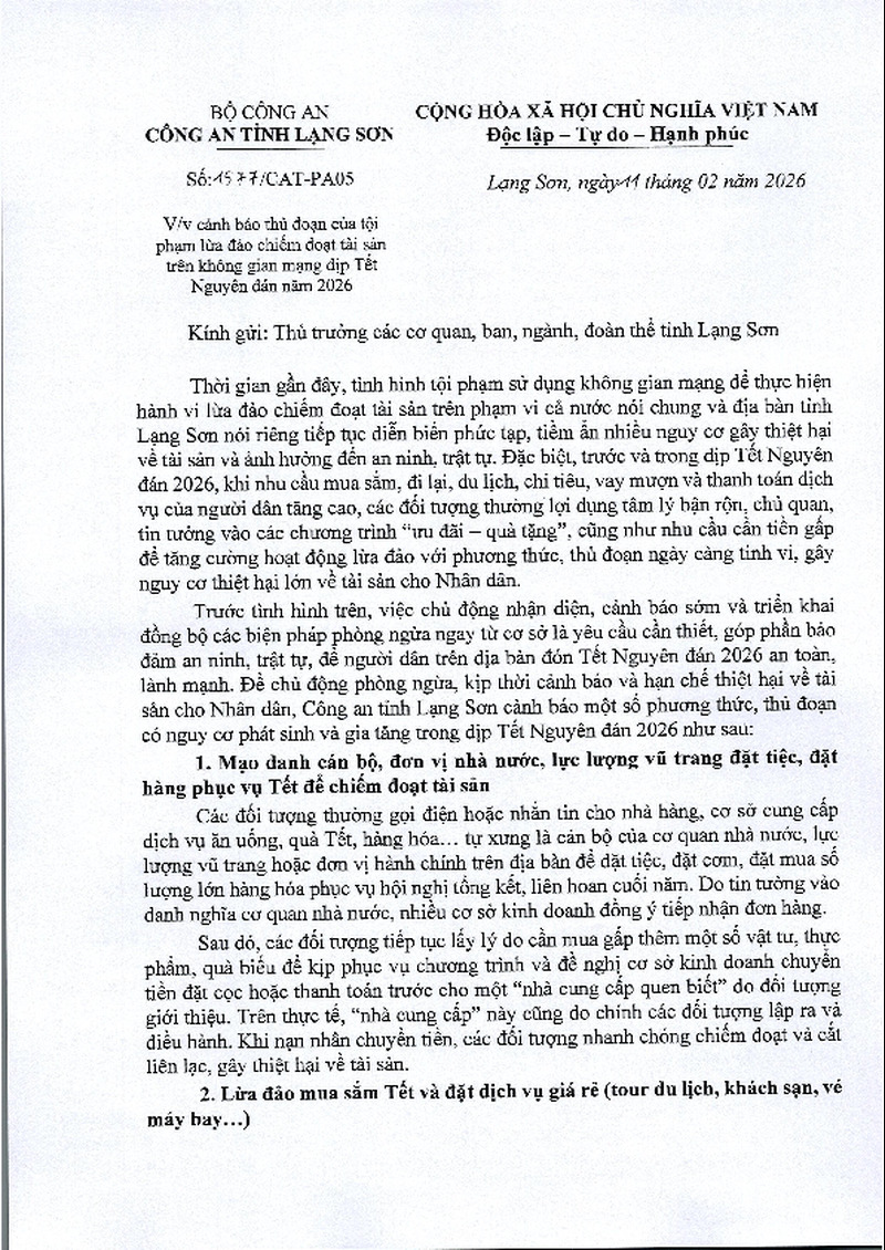 | Tiêu đề văn bản | V/v cảnh báo thủ đoạn của tội phạm lừa đảo chiếm đoạt tài sản trên không gian mạng dịp Tết Nguyên đán năm 2026 | ||