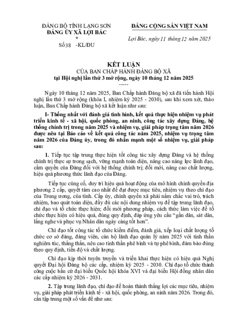 | Tiêu đề văn bản | KẾT LUẬN CỦA BAN CHẤP HÀNH ĐẢNG BỘ XÃ tại Hội nghị lần thứ 3 mở rộng, ngày 10 tháng 12 năm 2025 | ||