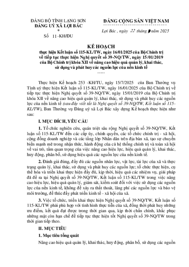 | Tiêu đề văn bản | KẾ HOẠCH thực hiện Kết luận số 115-KL/TW, ngày 16/01/2025 của Bộ Chính trị về tiếp tục thực hiện Nghị quyết số 39-NQ/TW, ngày 15/01/2019 của Bộ Chính trị khóa XII về nâng cao hiệu quả quản lý, khai thác, sử dụng và phát huy các nguồn lực của nền kinh tế | ||