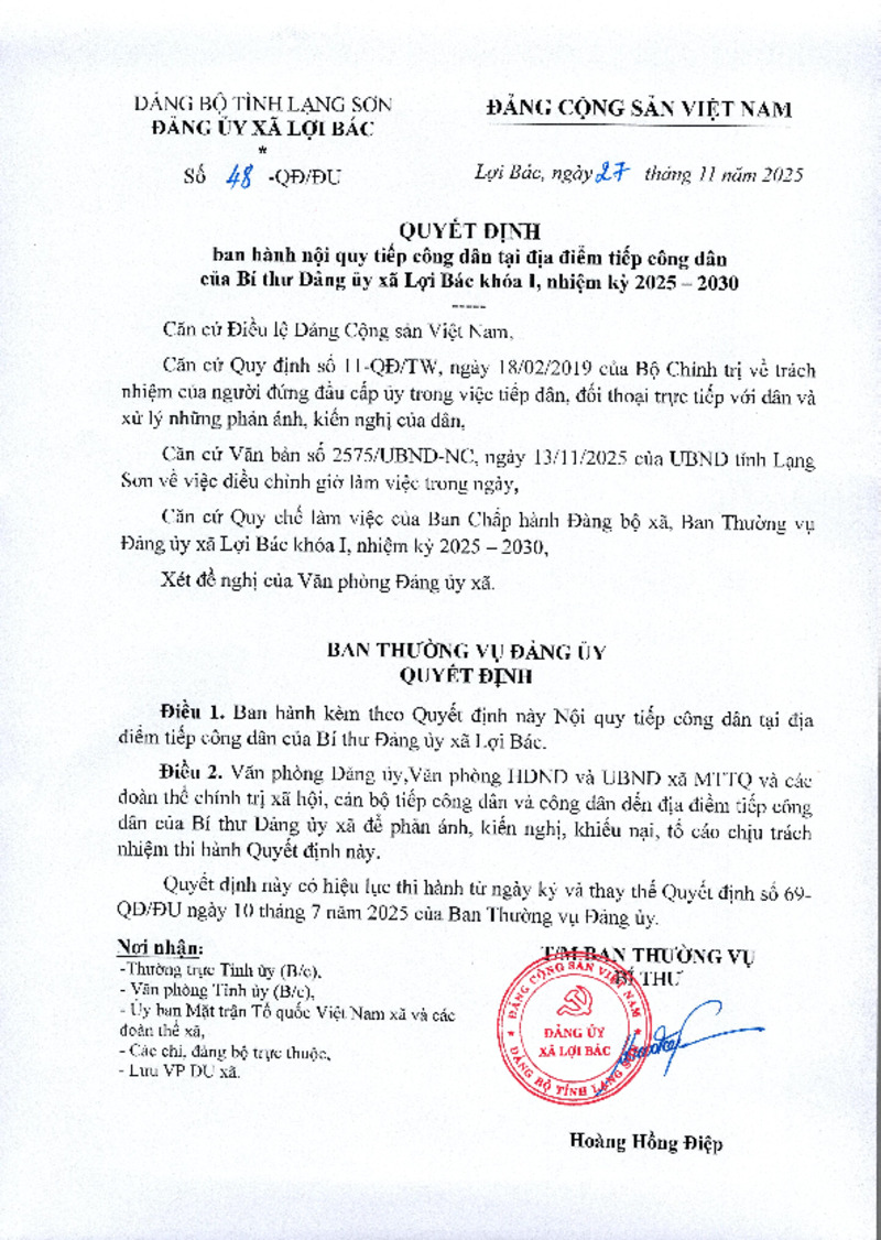 | Tiêu đề văn bản | QUYẾT ĐỊNH ban hành nội quy tiếp công dân tại địa điểm tiếp công dân của Bí thư Đảng ủy xã Lợi Bác khóa I, nhiệm kỳ 2025 – 2030 | ||
