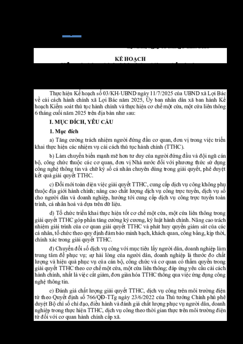 | Tiêu đề văn bản | KẾ HOẠCH Kiểm soát thủ tục hành chính và thực hiện cơ chế một cửa, một cửa liên thông 6 tháng cuối năm 2025 trên địa bàn xã Lợi Bác | ||