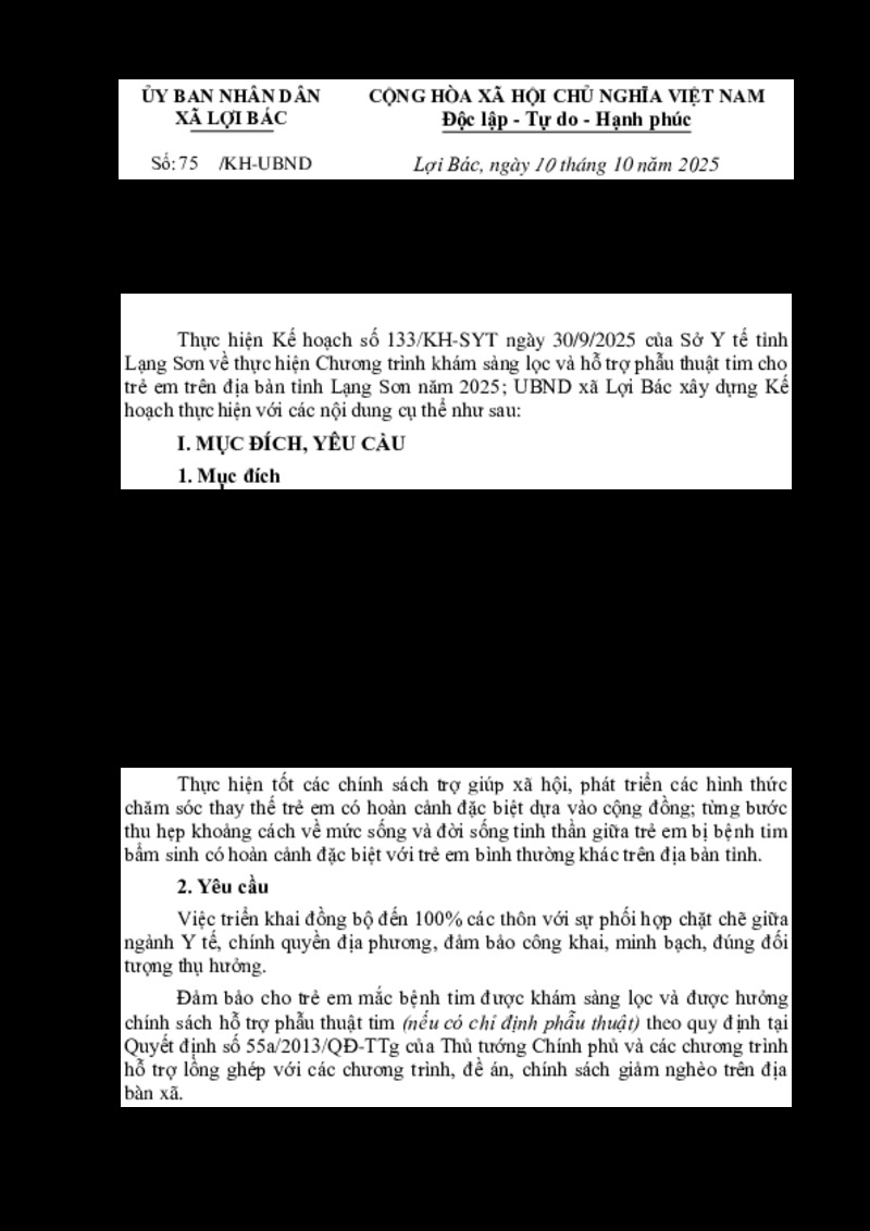 | Tiêu đề văn bản | KẾ HOẠCH Thực hiện Chương trình khám sàng lọc và hỗ trợ phẫu thuật tim cho trẻ em trên địa bàn xã Lợi Bác năm 2025 | ||