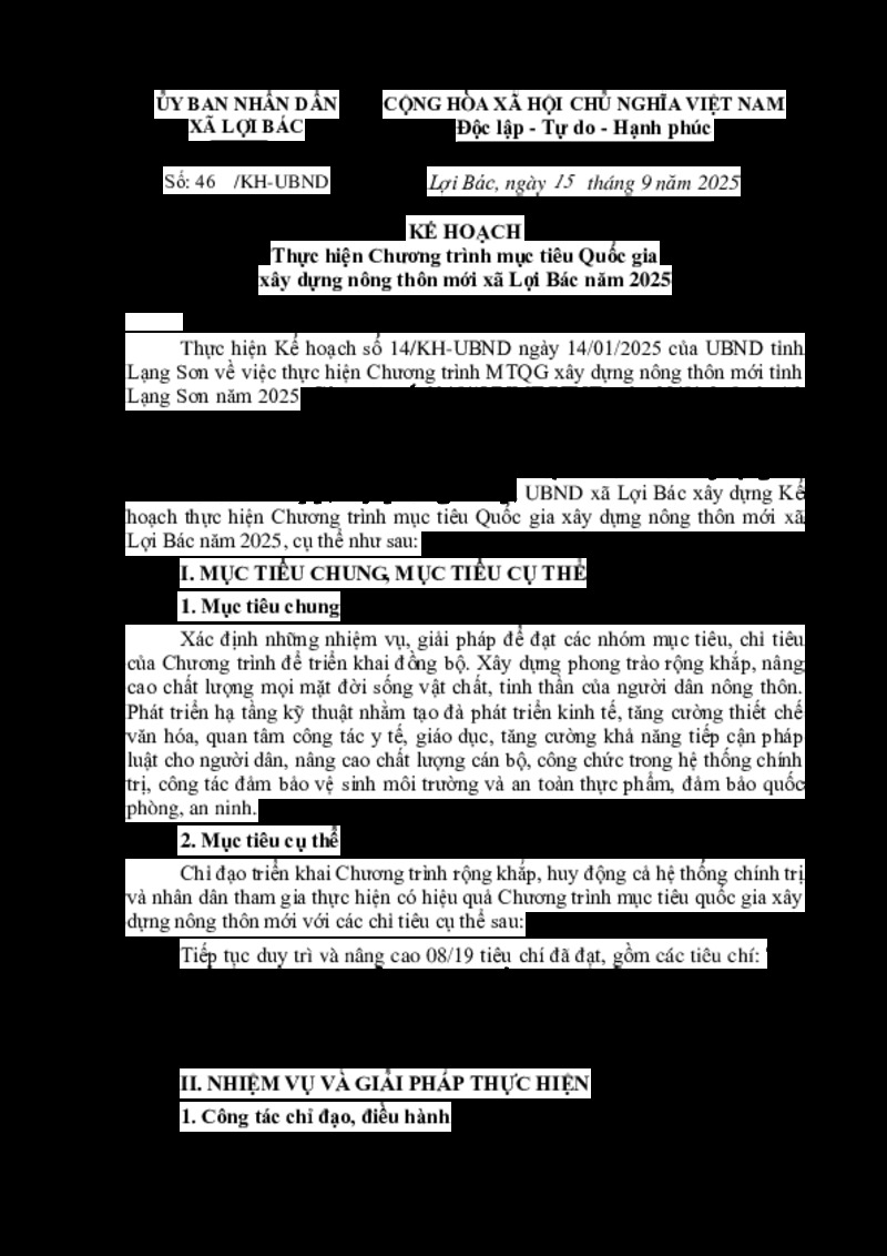 | Tiêu đề văn bản | KẾ HOẠCH Thực hiện Chương trình mục tiêu Quốc gia xây dựng nông thôn mới xã Lợi Bác năm 2025 | ||
