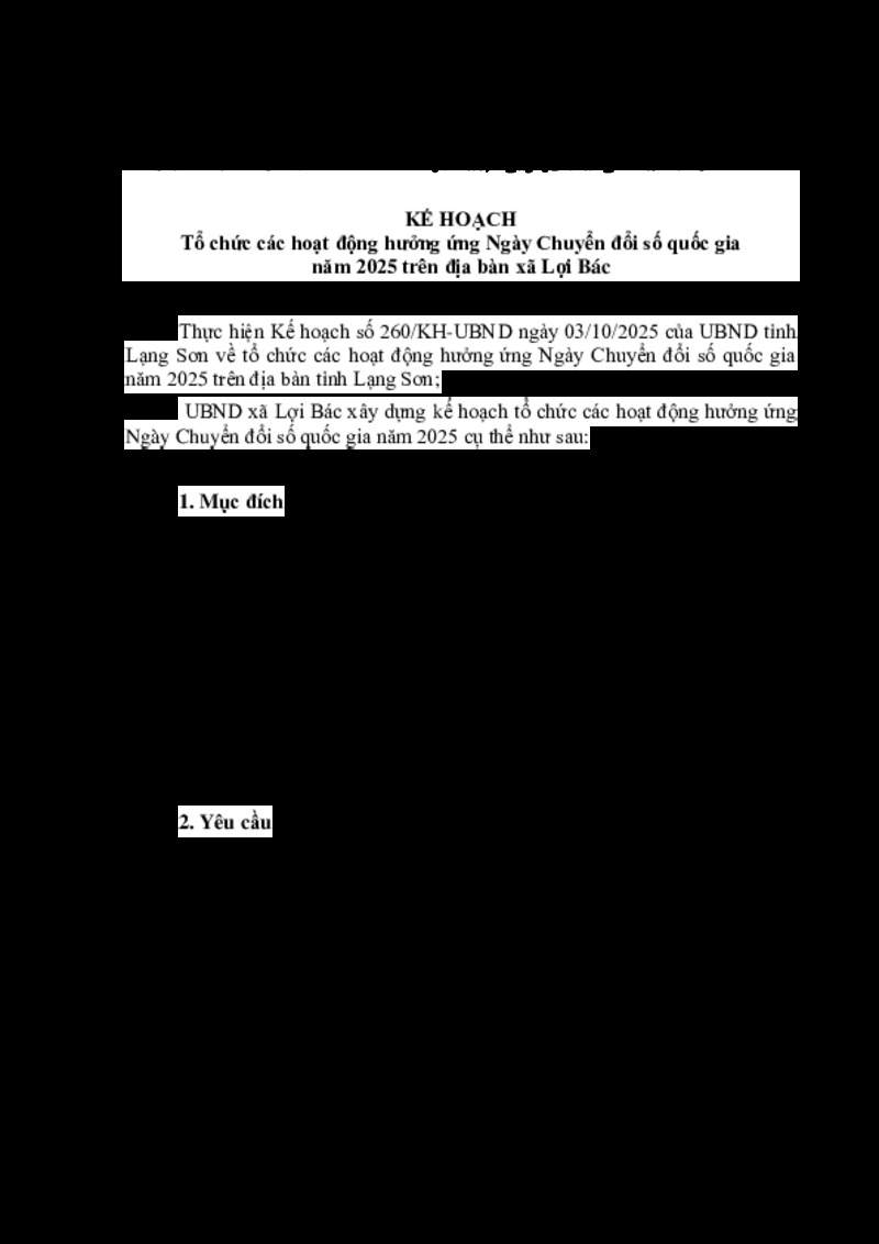 | Tiêu đề văn bản | KẾ HOẠCH Tổ chức các hoạt động hưởng ứng Ngày Chuyển đổi số quốc gia năm 2025 trên địa bàn xã Lợi Bác | ||