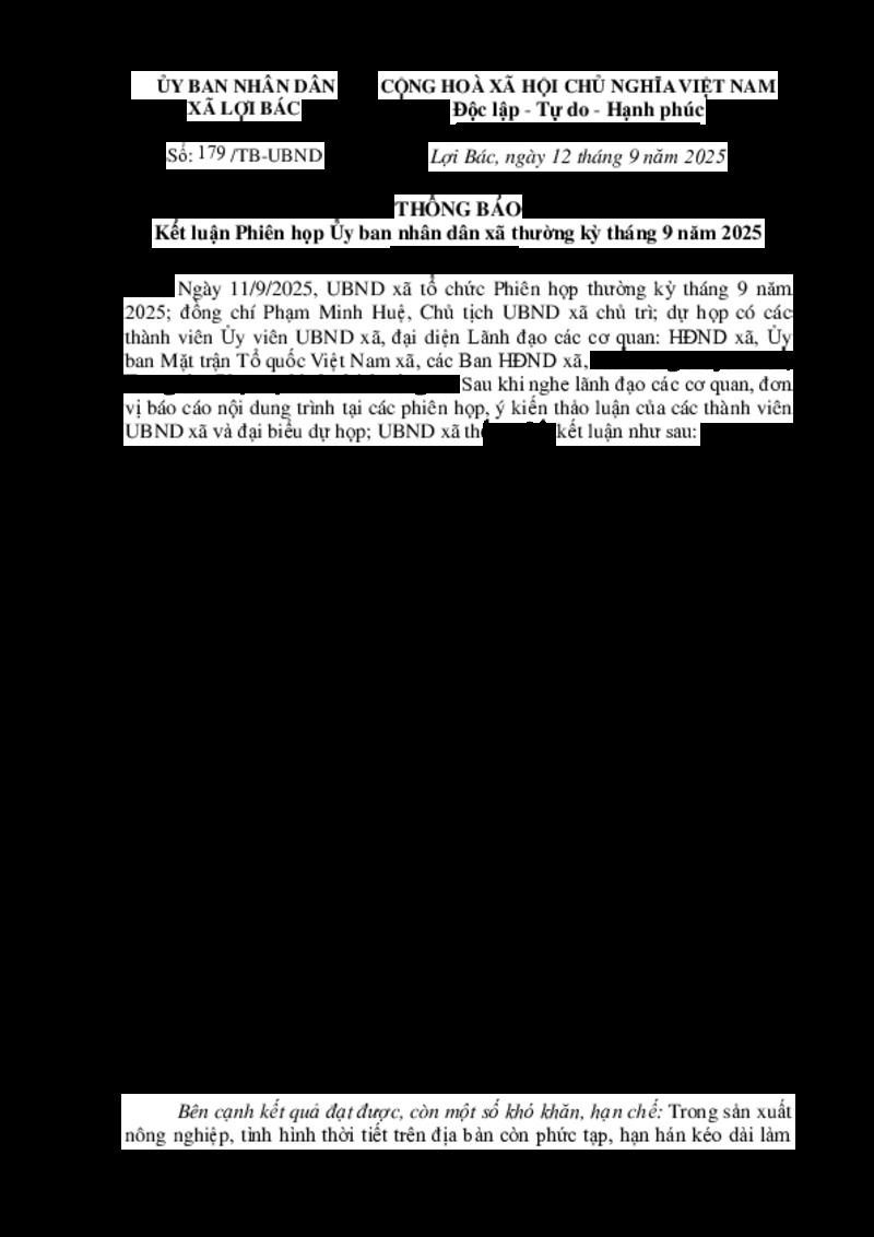| Tiêu đề văn bản | THÔNG BÁO Kết luận Phiên họp Ủy ban nhân dân xã thường kỳ tháng 9 năm 2025 | ||
