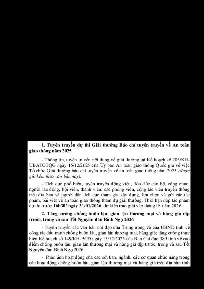 | Tiêu đề văn bản | V/v tuyên truyền dự thi Giải thưởng Báo chí tuyên truyền về An toàn giao thông năm 2025; tăng cường chống buôn lậu, gian lận thương mại và hàng giả dịp trước, trong và sau Tết Nguyên đán Bính Ngọ 2026 | ||