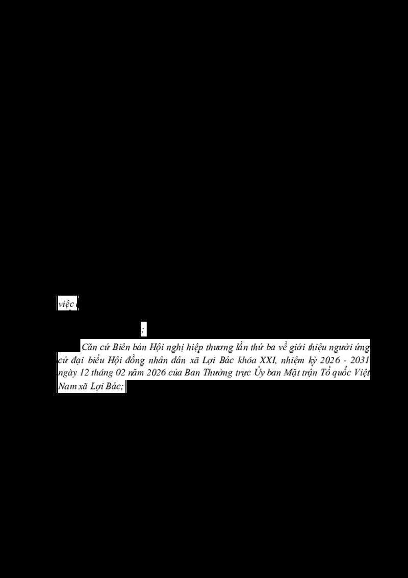 | Tiêu đề văn bản | NGHỊ QUYẾT Về việc công bố danh sách chính thức những người ứng cử đại biểu Hội đồng nhân dân xã Lợi Bác khóa XXI, nhiệm kỳ 2026 - 2031 theo từng đơn vị bầu cử | ||